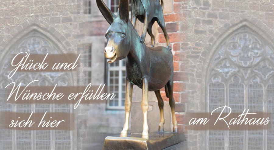 Die Bremer Stadtmusikanten sind eines der bekanntesten Wahrzeichen Bremens. Die inzwischen weltberühmte Bronzeskulptur von Gerhard Marcks wird täglich von unzähligen Besuchern bewundert. Vielleicht gehören die Stadtmusikanten in die Liste der hundert am meisten fotografierten Sehenswürdigkeiten. Die Beine und das Maul des Esels sind fast goldig blank von den Brührungen der Menschen, die sich hier Glück und die Erfüllung ihrer Wünsche erhoffen. Seit 1953 steht die über zwei Meter hohe Bronzeplastik auf ihrem Sockel neben dem Rathaus gleich neben dem Eingang zum Bremer Ratskeller. 1819 wurde das Märchen von den Bremer Stadtmusikanten erstmals mit einer Sammlung anderer Geschichten von den Gebrüdern Grimm veröffentlicht.