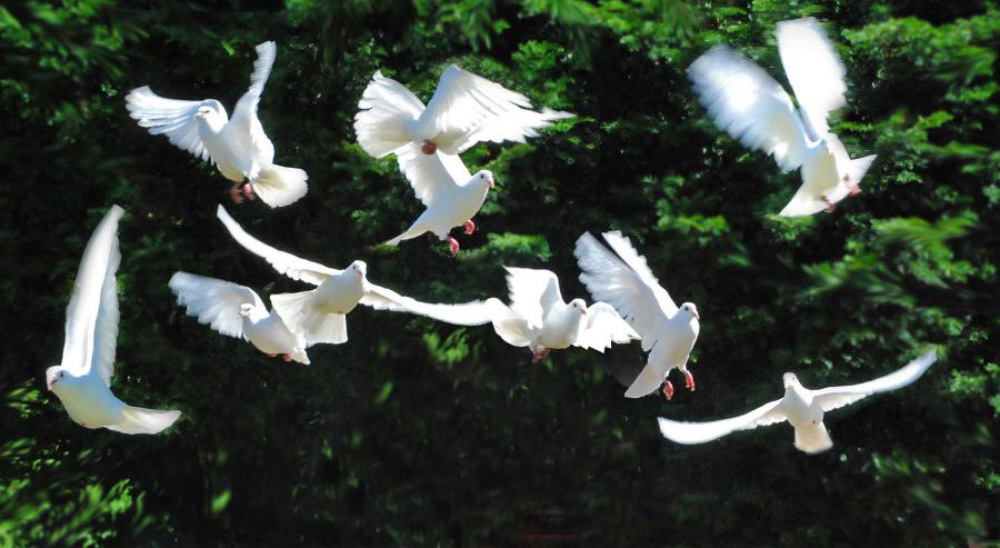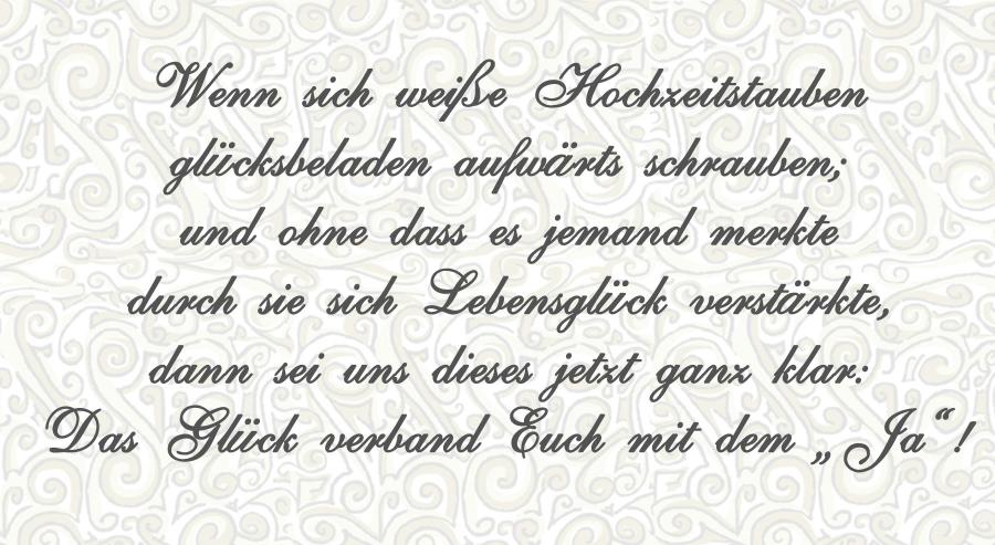 Ein Hochzeitsgedicht über weiße Hochzeitstauben finden Sie hier. Weiße Tauben am Tage der Hochzeit in den Himmel fliegen zu lassen hat viel symbolische Kraft. Es ist eine Botschaft an die Liebe und den Anfang des gemeinsamen Lebens als Paar.