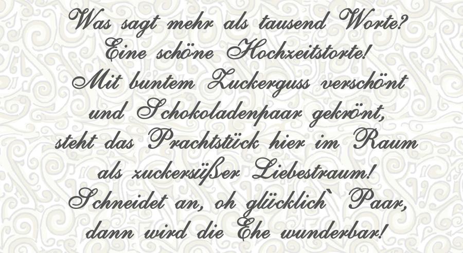 Wenn die Hochzeitstorte serviert wird, ist die Feier fast vorbei. Die süße Torte stimmt ein auf die letzten Stunden der Feier. Fast schon eine Zeremonie sollte es sein, die Torte anzuschneiden. Dazu ist ein schöner Spruch oder ein Gedicht über die Hochzeitstorte passend. Hier finden Sie das richtige Gedicht zur Hochzeitstorte.