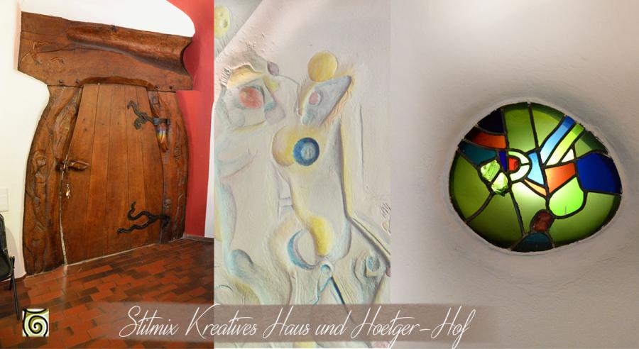 Bereits die Haustüre ist ein "Willkommen" zu einer Reise zur Erkenntnis, dass es auch anders geht. Es ist, als beträte man eine fremde Welt aus einem schönen Traum, den die Natur hat entstehen lassen. Offenbar war der Hoetger-Hof die besondere Station, die Hoetger für weitere phantasievolle Bauwerke brauchte. Eine Entsprechung findet sich im Kaffee Worpswede.