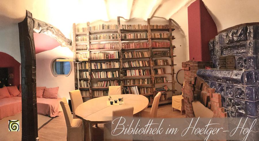 Die Bibliothek ist ebenfalls im Originalzustand erhalten. Bücher seiner Zeit wurden nachgestellt. Der Raum wirkt lebendig wie zur Zeit Hoetgers. Um sich in die alte Zeit zu versetzen müssen hier die Augen geöffnet bleiben und was sonst nicht möglich erscheint: Die Zeit hat Buchstaben, sie kann "gelesen" werden.