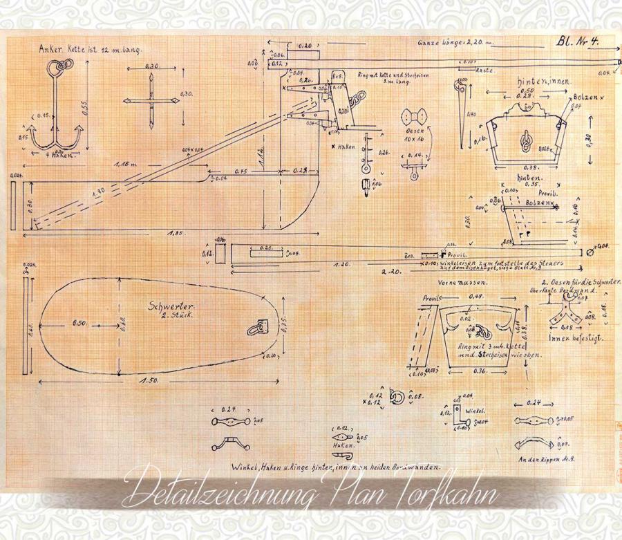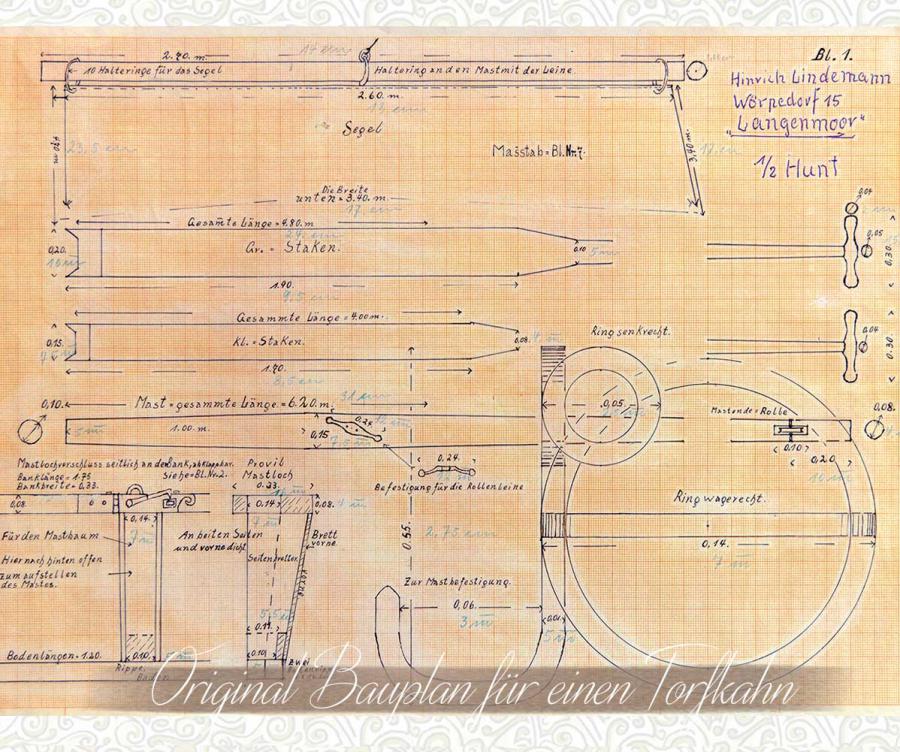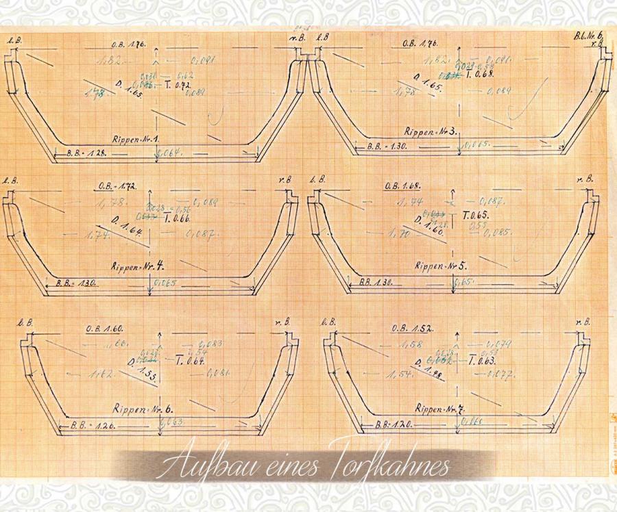 Ein historischer Bauplan für Torfschiffe ist recht selten. Aus den Anfängen des Baues von Torfkähnen vor ca. zwei Jahrhunderten sind keine Zeichnungen überliefert und so wurden die vielen Torfkähne mehr nach handwerklichem Können und Erfahrung gezimmert.