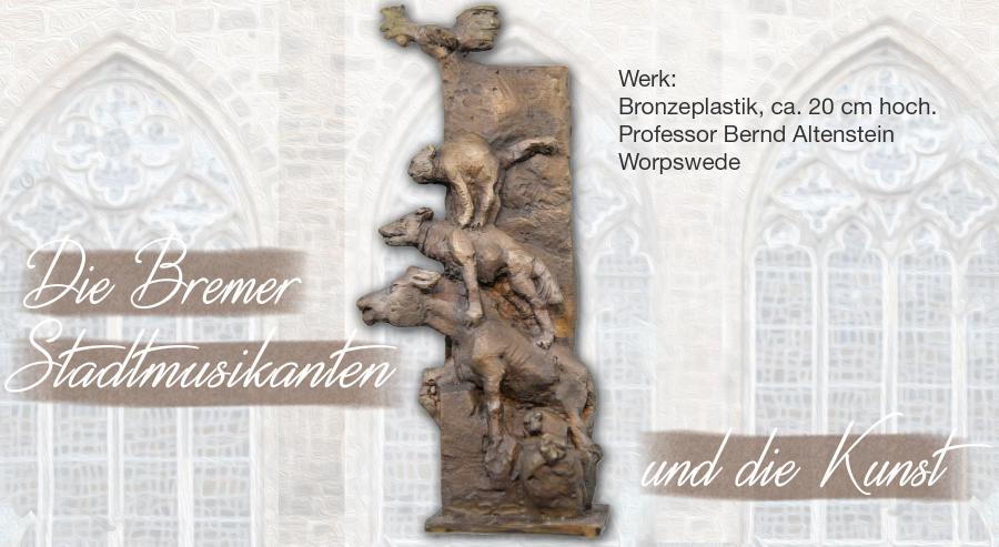 Die Bremer Stadtmusikanten haben seit jeher Künstler und ihre Kunst beeinflusst. Stellvertretend für viele fantasievolle Darstellungen und Interpretationen steht hier ein Werk als ca. 20 cm hohe Bronzeplastik von Professor Bernd Altenstein aus seinem Atelier in Worpswede. Die Stadtmusikanten sind gewissermassen und unbeabsichtigt wie von selbst zu einer Marke Bremens herangereift. Die Geschichte dahinter und die ungewöhnliche Erscheinung der in ihrer Art verschiedene Tiere kann einprägsamer nicht sein. Das bisher schon recht bekannte Märchen wurde mit der Bronzeskulptur auf dem Bremer Marktplatz praktisch zu einem weltweit bekannten Markenzeichen für Bremen. Kein Wunder also, dass Darstellungen aller Art zu einer beliebten Erinnerung an Bremen wurden. Heute gibt es die Stadtmusikanten in praktisch jeder Variante als Kunst oder kunstgewerbliche Objekte.