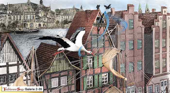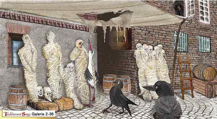 "Wie unwürdig, ich werde von Raben gejagt." Der Storch Sir Adular gab sich alle Mühe, so auszusehen wie die Mumien, um nicht erkannt zu werden. Auch am Hafen an der Schlachte waren zu damaliger Zeit Mumien entladen worden für die Apotheken. Aber das ist eine lange Geschichte ...