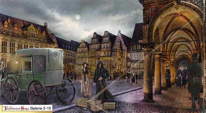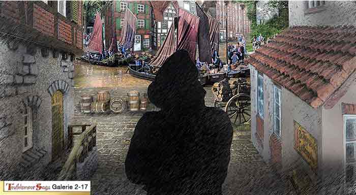 An der Schlachte in Bremen plante der Schwarze Vogt erste Entwürfe für seine Maschine. Selbst sein blauer Kristall war dieses Mal nicht geeignet, die Bedrohung zu erkennen. Damals um 1850 war der Schlachte-Hafen zu einem unbedeutenden Anleger verkommen. Nun hoffte der Vogt, das Blatt mit seinem Unternehmen wenden zu können.