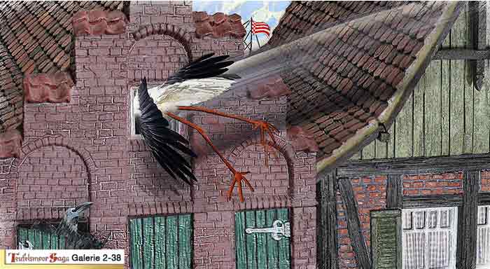 Die Spione des Vogts wurden vom Storch Sir Adular, der sich schlafend stellt, ausgespäht. Inzwischen war das das erste Material für die monströse Torfabbaumaschine in der riesigen Scheune angekommen. Ab hier wird das neue Torfabbaugebiet beginnen. Alles war im Teufelsmoor für den Vogt vorbereitet.