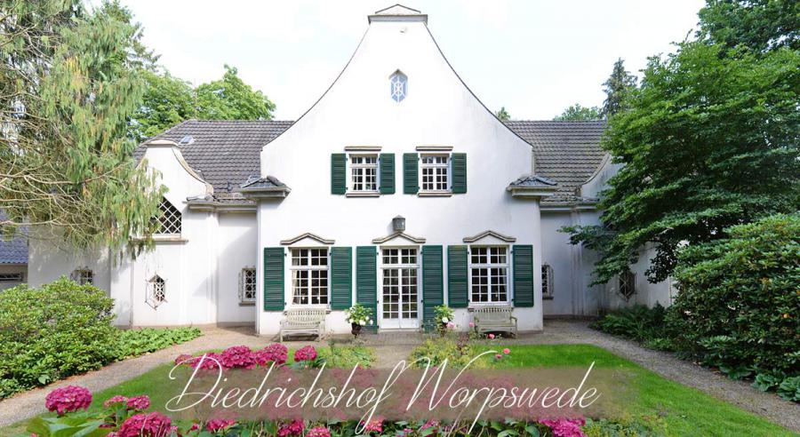 Bis zur Gartenkunst reichte das künstlerische Schaffen Bernhard Hoetgers, der in Worpswede bis heute prägende Spuren hinterlassen hat. Die Beschäftigung mit einer klar strukturierten Gartenarchitektur folgte der Logik seines Arbeitens in dieser Zeit. Ob eine Einzelarbeit oder ein Gesamtkunstwerk, hier auf dem Diedrichshof wurde die konsequente Umsetzung des Lebens im Hause bis in den Außenbereich fortgesetzt. Alles passt zusammen und der Blick aus dem Haus über die großzügige Terrasse findet erst an der großen Plastik (Der Bonze des Humors) am hinteren Ende des Gartens halt. Dennoch bleibt der Eindruck vielfältig, denn in den durch Hecken gestalteten Achsen und perspektivischen Linien haben weitere Skulpturen ihren exponierten Auftritt.