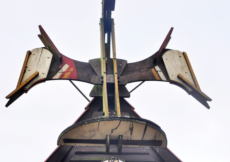 Die sonderbar anmutende Skulptur auf dem Giebel erinnert an einen Vogel, der die Schwingen öffnet.