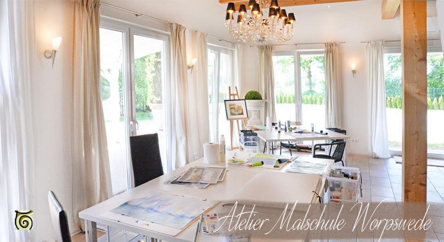 Die MALSCHULE WORPSWEDE lädt Sie genau dazu herzlich ein. Unsere Mal- und Kreativ-Kurse finden an einem wahrlich inspirierendem Ort statt. In einem neuen Haus in Worpswede Neu St. Jürgen haben wir für Sie das Atelier der Malschule Worpswede eingerichtet. Der weite, helle Raum mit Balkendecke und Kronleuchtern ist modern und erinnert doch an die alte Zeit der ersten Maler. Es ist zwar kein direkter Vergleich, aber Heinrich Vogeler ging als einer der ersten in Worpswede ebenso ungewöhnliche Wege mit dem Bau seiner kreativen Welt, dem Barkenhoff. Das Atelierhaus Worpswede liegt am Rande des Gewerbegebietes Neu St. Jürgen mit unmittelbarem Blick in die lange Teufelsmoorstraße, einer Allee, die durch das alte Dorf Teufelsmoor führt. Mit etwas Glück zieht von Westen oft der berühmte Himmel über Worpswede auf, den die ersten Maler so liebten.