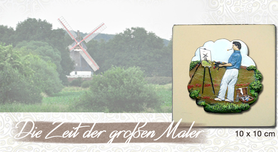 Dieses Motiv der Sammelserie steht für die ersten Maler, die Worpswede, die Landschaft und das besondere Licht für ihr Kunstschaffen entdeckt haben. Die meisten Bilder der ersten Malergeneration widmen sich der faszinierenden Landschaft. Dieses Wandgemälde am „Worpsweder Schlösschen“ zeigt einen Maler in der Landschaft Worpswedes bei der Arbeit an der Staffelei. Das Gemälde ist mit ca. 5 x 3 m von beachtlicher Größe und man schaut mit dem Künstler über sein Werk in die Wiesen und Felder in der Nähe der Worpswede Mühle. Fast so wie vor über hundert Jahren.