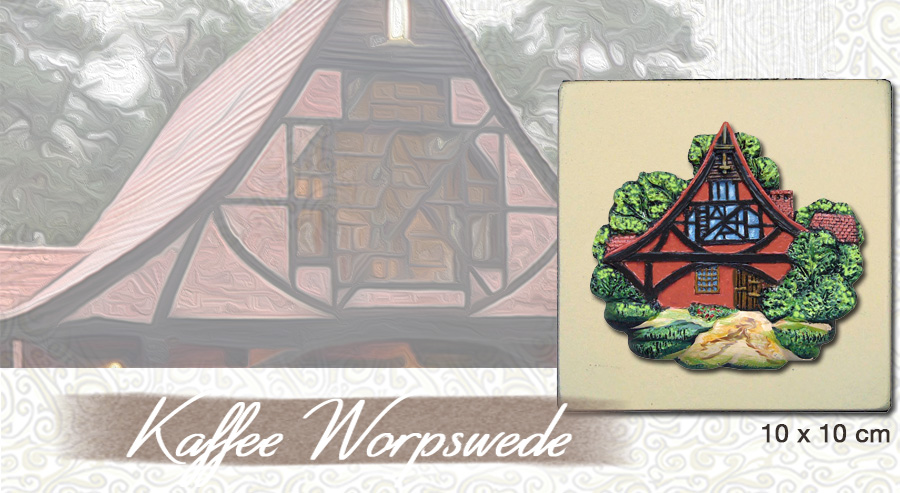 Als Künstler und Bildhauer schuf Hoetger dieses fantasievolle Gebäude um seine Arbeiten auszustellen und zu vermarkten. Es gab ein Modell als Hausentwurf, jedoch keinen Plan im heutigen Sinne. Ganz ohne rechte Winkel erschuf er ein Gesamtkunstwerk, das jeden Besucher zutiefst überrascht. Dennoch ist die Formensprache überaus harmonisch und lässt uns jede Gleichförmigkeit vergessen. Der ehrliche Volksmund taufte das Haus „Kaffee Verrückt“, denn er verwendete krumme Balken für das Fachwerk und ließ sich Ziegelsteine liefern, die wegen Rissen, Beulen oder Fehlfarben allgemein nicht verwendet wurden. Der Mut, abseits der geltenden Norm zu bauen wurde letztlich als „Verrückt“ tituliert. Dennoch und vielleicht gerade darum hat Worpswede eine Sehenswürdigkeit, die unsere Augen überrascht. Das Kaffee Worpswede durfte also in der Sammelserie der Worpsweder Motive nicht fehlen.