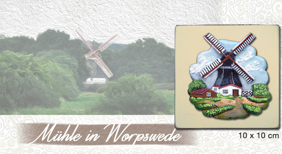 Selten fügt sich eine historische Mühle so harmonisch in die Landschaft ein. Bekannt als Mühle vom Rattenberg, wurde der Vorläufer der heutigen Mühle im Jahre 1701 erbaut. 1838 entstand die heutige Mühle vom Typ Erdholländer. Sie wurde zur Erhaltung der Wirtschaftlichkeit oft umgebaut und dennoch war der Betrieb bereits Mitte des letzten Jahrhunderts nicht mehr rentabel. Die Freunde Worpswedes e.V. haben großartiges geleistet um diese schöne Mühle für die Nachwelt zu erhalten. Die Mühle in Worpswede ist voll funktionsfähig und ein Besuch führt Sie zurück in eine andere Zeit. Das passende Sammelmotiv gibt es als kleines Wandbild bei Decoramic oder in im Shop der Touristen Information in der Bergstrasse.