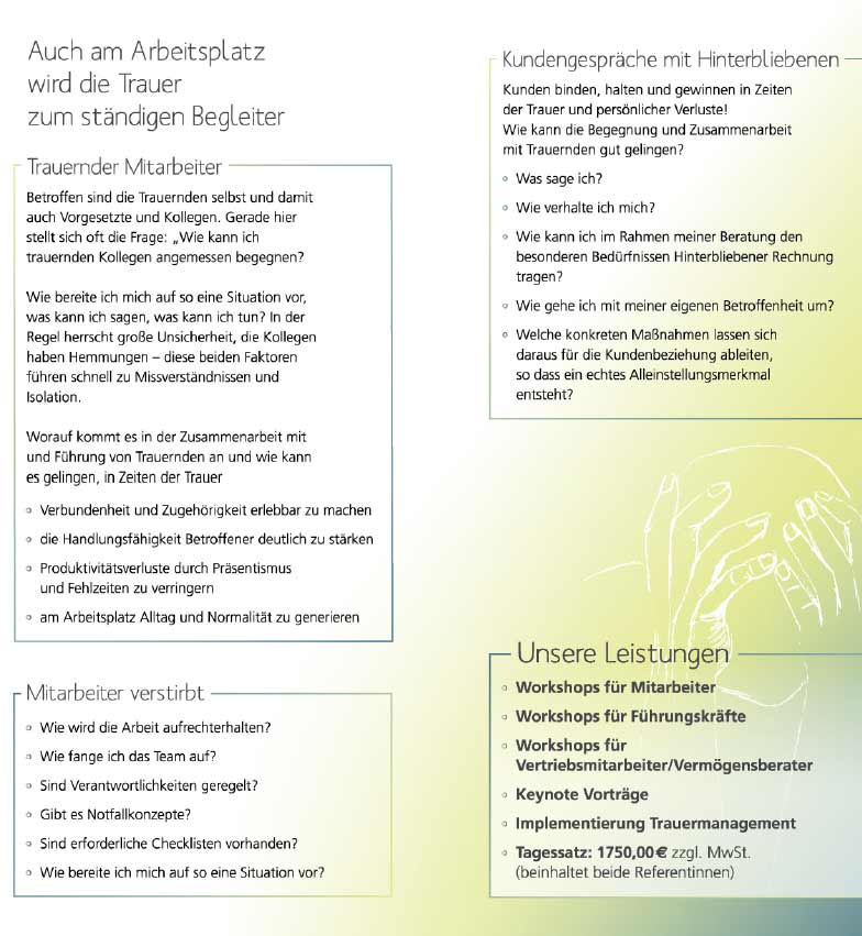Sie möchten Ihren Kunden einmal etwas ganz Besonderes bieten und das Thema Trauer – entweder „Allgemein“, „Trauermanagement im Unternehmen“ oder „Trauer am Arbeitsplatz“ als weiteres Thema mit einbinden? Sie suchen Räumlichkeiten mit Moderation, wo Sie sich um gar nichts kümmern müssen?