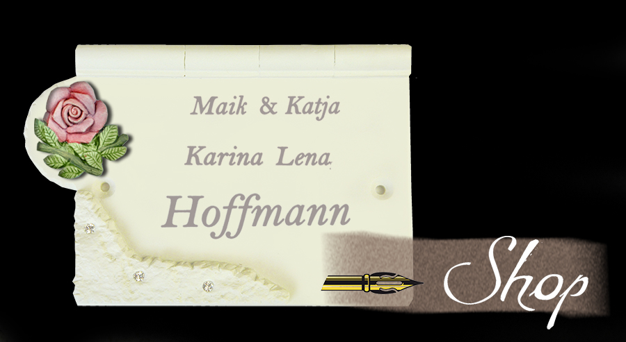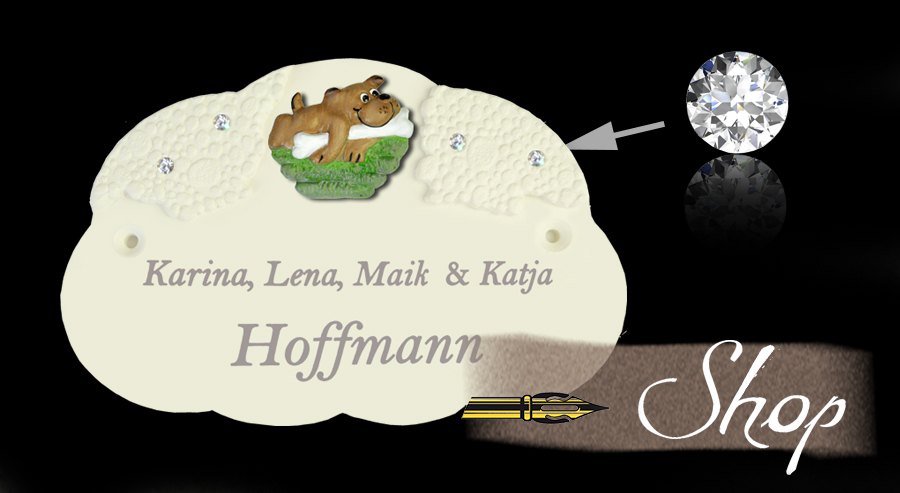 Eine neue Idee für Türschilder mit Phantasie! Moderne, helle modellierte Haustürschilder mit Kristallen leuchten ihren Gästen entgegen. Dezent und dennoch auffällig sind die kleinen Kristalle, die bei Licht nicht zu übersehen sind. Auf das Türschild passen viele Namen und mit den Motiven zum Aussuchen finden Sie genau das Richtige für ihren Geschmack. So zeigen sie schon vor der Haustür, was ihnen gefällt. Ihr Name bekommt einen ganz anderen Ausdruck mit diesen stilvollen Türschildern.