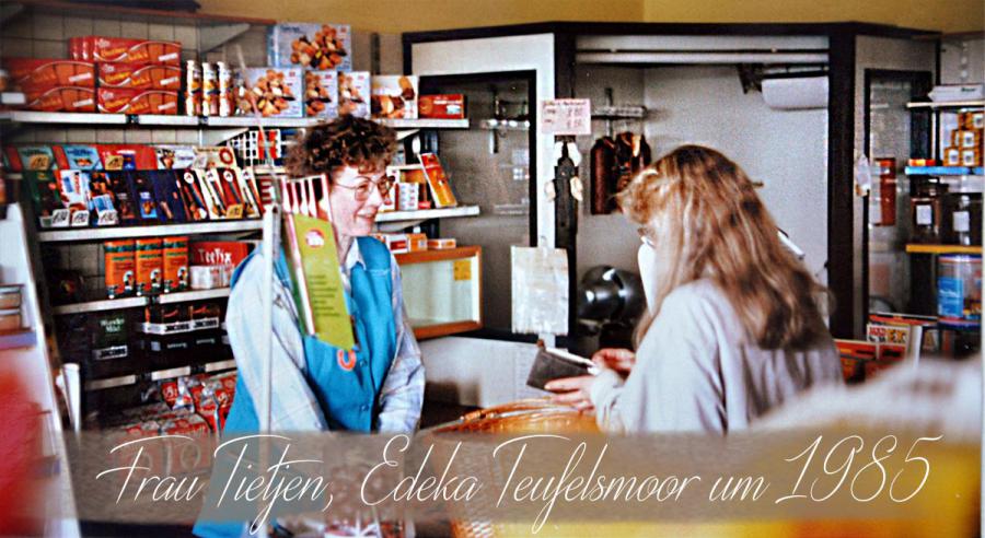 Es wurden Bilder gefunden, die einen Einkauf um 1985 im Alten Edeka Laden Teufelsmoor dokumentieren. Der Edeka Laden an der Teufelsmoorstrasse Nr. 66 (Alte Hausnummerierung!!!) war über Jahrzehnte eine Anlaufstelle für den Einkauf des täglichen Bedarfs im Ort. Soweit bekannt, war das Geschäft gleichzeitig die Poststelle im Ort ab mindestens ab 1980 (wahrscheinlich aber schon vorher) bis kurz vor Aufgabe des Geschäftsbetriebes nach dem Tode von Herrn Martin Tietjen.
