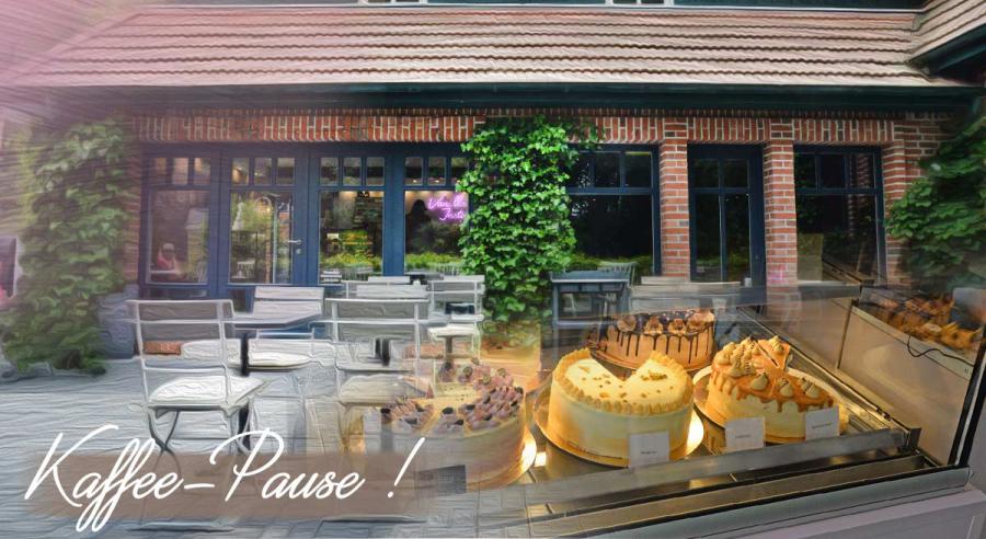 Unsere kleine Fotomontage hat die Torten und Kuchen mit auf die fast schon romantische Außenterrasse mitgenommen. Das Café Vanilla Instinkt liegt leicht erhöht über der Findorffstraße. Schauen Sie "um die Ecke" und finden Sie das Café unter den alten Bäumen. Ein Geheimtipp!