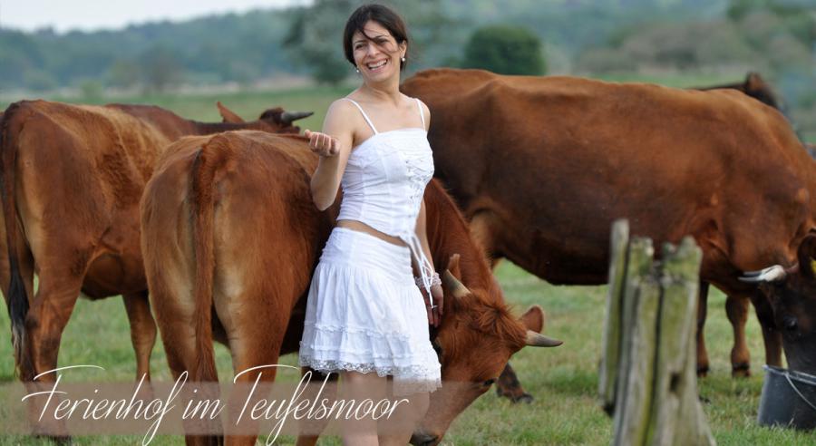 Ganz wie von selbst kommt das Glück mit den Tieren in der Natur. Die Kühe auf dem Biohof Lütjen-Wellner leben fast völlig frei. Zäune sieht man erst am Horizont. Die Tiere leben artgerecht in ihrer Herde und haben die Kälber immer dabei. Kommen Sie ins zu uns ins Teufelsmoor!