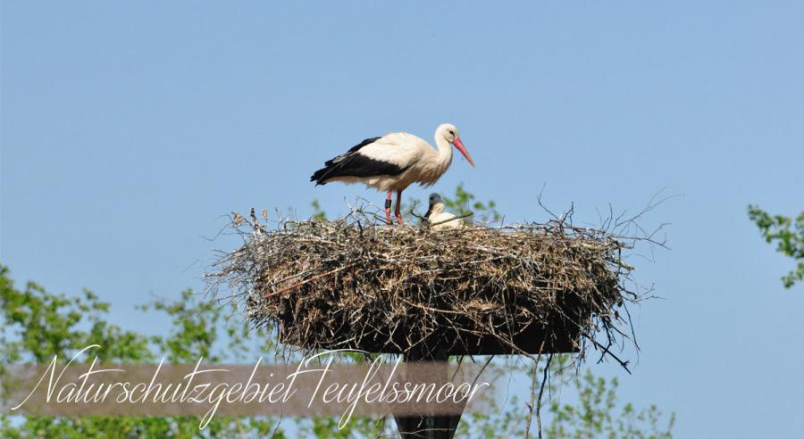 So viele Jahre hatte man sie hier nicht gesehen. Die Störche sind wieder heimisch geworden in dem weiten Teufelsmoor. Seit die Flächen für den Naturschutz immer mehr ausgeweitet wurden, können diese wundervollen majestätischen Vögel wieder bewundert werden. Übrigens brüten Störche jedes Jahr auf dem Biohof Lütjen-Wellner. Das Nest ist auf einem Pfahl hoch oben neben dem offenen Kuhstall und etwa 100 m vor dem Ferienhaus. Die Störche sind nicht scheu und man kann sie direkt beobachten.