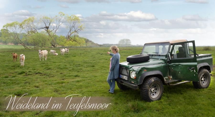 Was sehen Sie zuerst auf diesem Bild? Eine ökologische Landwirtschaft oder den Himmel über Worpswede? Beide Motive können verzaubern. Ist es nicht herrlich zu sehen, wie die Kühe und ihre Kälber in freier Natur unterwegs sind? Kennen Sie noch die glücklichen Kühe aus der alten Werbung? Hier gibt es sie noch oder besser gesagt: es gibt sie wieder.