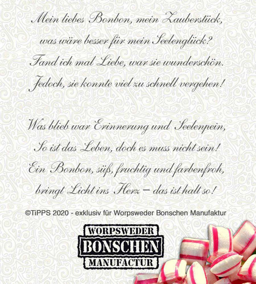 Die Geschichte das Bonbon ist eng verknüpft mit dem Genuss und hat einen Hauch von Poesie. Etwas so Einfaches und Ursprüngliches wie ein klassisches Bonbon hat sich über die Jahrhunderte kaum verändert. Darum hier als Gedicht eine Liebeserklärung an das Bonbon, die zu allen Zeiten so hätte gesagt werden können.