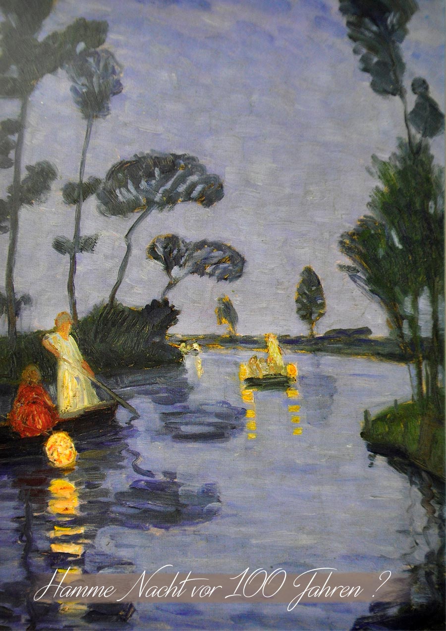 Haben die Alten Meister aus Worpswede die moderne HammeNacht vorhergesehen? Dieses alte Gemälde zeigt ein stimmungsvolles Bild von der Hamme oder einem der Torfkanäle. Sicherlich wurde eine reale Szene die Vorlage für dieses Bild. Fest steht sicherlich, dass die ersten Künstler in Worpswede von der Anziehungskraft der Landschaft und des Himmels überwältigt waren. Wie sonst würde man zu diesen vielen schönen Motiven finden?