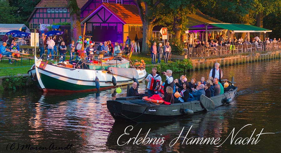 Die HammeNacht in Worpswede ist eine Gelegenheit, Torfkahnfahrten am Abend und in der Nacht in romantischer Atmosphäre zu genießen. Torfkähne und viele bunt beleuchtete Stationen laden am Ufer zum Verweilen ein. Die Torfschiffer haben oft Live-Musik an Bord und zu fröhlichen Klängen ist die Fahrt im Torfkahn ein unvergessliches Erlebnis in der Nacht. Zwar kann mit einem Ticket an mehreren Stationen ein- und ausgestiegen werden, jedoch bietet sich auch eine lange Reise an. Nur zur jährlichen HammeNacht und alle drei Jahre zur Torfkahnarmada fahren Torfkähne über die Wümme von Worpswede bis nach Bremen. Gleichzeitig sind die Bremer Torfschiffer vom Torfschiffhafen in Bremen-Findorf über die Stadtkanäle und die Hamme unterwegs nach Worpswede. Aber die HammeNacht ist nur eine Torfkahnfahrt. Als gesellschaftliches Ereignis trifft man Freunde und Bekannte an den Anlegern, die beteiligten Gastronomiebetriebe bieten typische Köstlichkeiten an und die Torfschiffer erzählen Geschichten aus dem Teufelsmoor.