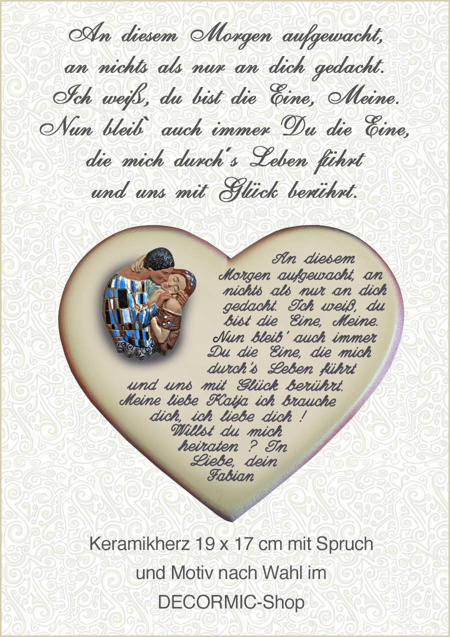 Wie für vieles Andere gilt auch für den Heiratsantrag: Es gibt nur eine Chance und die muss passen. Hier ist eine Anregung für einen originellen Heiratsantrag. Ein Herz aus Keramik wird mit dem Text Ihrer Wahl graviert. Viele passende Motive der Liebe können ausgesucht werden. Im Decoramic Shop können die Keramikschilder frei konfiguriert werden. Der Klick auf dieses Gedicht leitet Sie weiter zu diesem Herz mit Spruch aus Keramik.