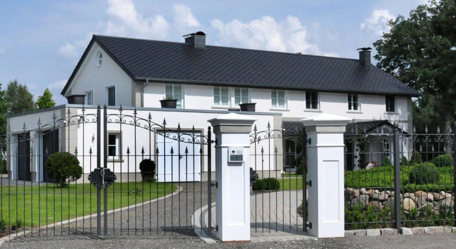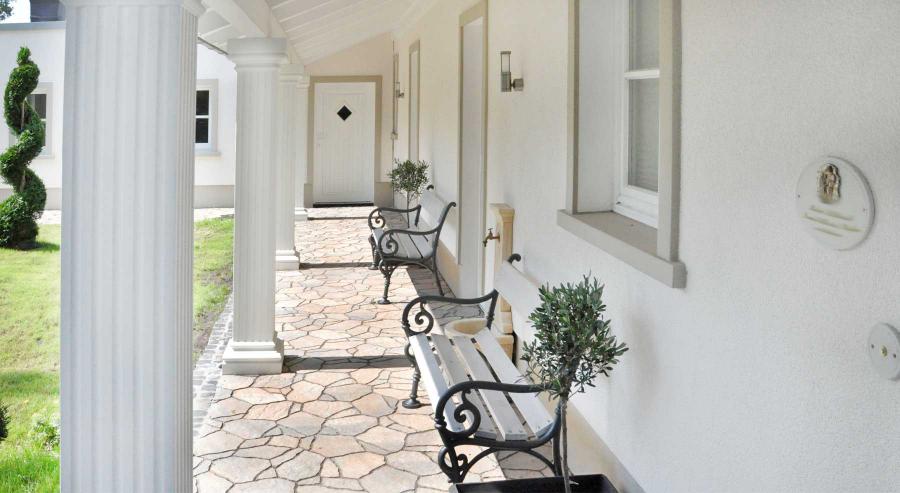 Stilecht der überdachte Gang zur Garage. In der Region zwischen Worpswede und Bremerhaven finden sich Gutshäuser, die in einfacher, oder so wie hier, baulich anspruchsvoller Weise, die Überdachungen auf Säulen ruhen lassen. Diese und ähnliche Säulen sind eine Spezialität der Firma Kück.