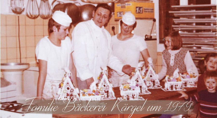 Familienfoto vor Weihnachten 1979 in der Backstube vor den gerade gestalteten zuckersüßen "Knusperhäuschen". Die Tradition dieser Zuckerbäckerei ist sehr alt und kommt aus einer Zeit, als Zucker etwas ganz Besonderes war. Diese üppige Verwendung gönnten sich viele nur zu Weihnachten. Die Wände der Häuschen waren aus Lebkuchenteig und darum sehr haltbar. Lange vor Weihnachten war so ein Kunstwerk aus Zucker und Lebkuchen eine Dekoration für das Fest. Natürlich wurde es dann zu Weihnachten "aufgeknuspert". Süße Erinnerungen...