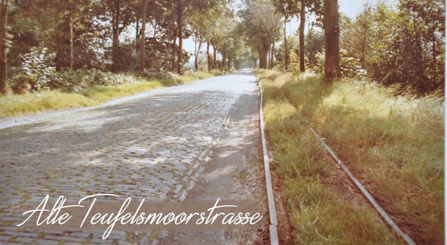Ein seltenes Bild der alten Teufelsmoorstrasse mit den Gleisen der Feldbahn an der Seite. Die Aufnahme entstand um 1988, kurz vor der Einstellung des Betriebes etwa 200 Meter weiter vom heutigen Denkmal in Richtung Neu St. Jürgen. Die mit hart gebrannten Klinkern im Jahre 1888 gepflasterte Strasse wurde verbreitert und ist heute asphaltiert.