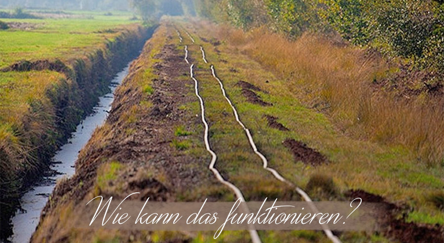 Wie kann ein solches Feldbahngleis funktionieren? Es wirkt unmöglich, dass darauf ein Lorenzug fahren kann. Wir haben uns sagen lassen, dass voll beladene Loren stabiler fahren und seltener entgleisen. Dieses Bild stammt aus neuerer Zeit und aus dem Günnemoor, das nordöstlich vom Dorf Teufelsmoor gelegen ist. Hier findet bis heute noch Torfabbau statt.