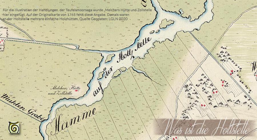 Auf diesem Kartenausschnitt wurde das Wort "Hamme" an eine für das Verständnis des Bildes passende Stelle gerückt. Die zur Illustration eingezeichnete "Melchers Hütte" existierte damals nicht in dieser Form und ist in der Originalkarte nicht verzeichnet. Gleichwohl soll es an der Hotlstelle als Umschlagplatz von Waren, einige Hammehütten gegeben haben, die jedoch im Winter mit den Überschwemmungen abgebaut wurden.