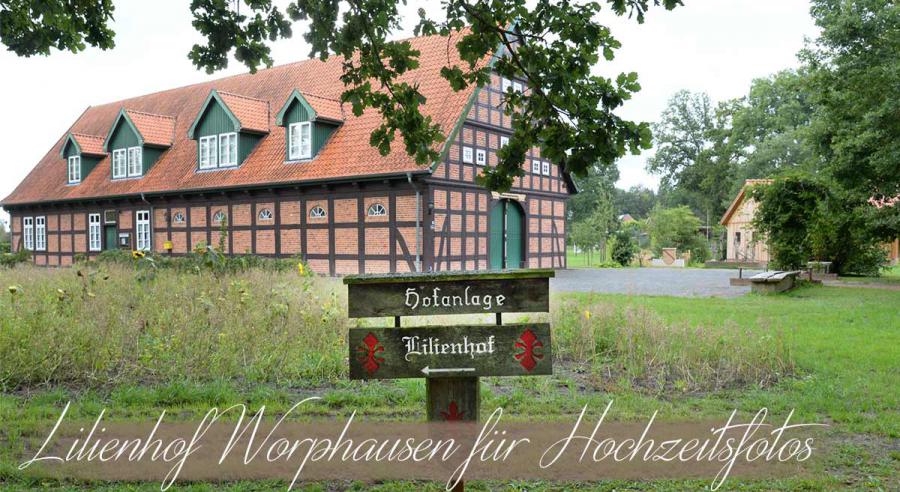Die Hochzeitsfotos sollten eine Erinnerung für das ganze Leben werden. Auf dem Lilienhof Worphausen ist die passende Kulisse aus jedem Blickwinkel sehenswert und verschiedene Themen laden ein, das Hochzeitspaar richtig in Szene zu setzen. Das Standesamt Worpswede bietet den Hochzeitsservice an, die Trauung auf dem Lilienhof durchzuführen. Es ist einfach, gleich nach der Trauung das weitläufige parkähnliche Gelände mit den wunderschönen restaurierten Fachwerkhäusern für die Hochzeitsfotos zu nutzen. Immer öfter werden die Fotolocations ganz gezielt ausgesucht. Dieses wichtige Shooting ist für das Hochzeitspaar ein Erlebnis, das für immer verbinden soll. Falls Sie auf dem Lilienhof heiraten möchten, sollten Sie die Hochzeitsfotografen informieren, wie Sie sich Ihre Welt der Erinnerung vorstellen. Oder Sie überlassen die Regie den Profis. Auf dem Gelände hier auf dem Lilienhof passen für lebendige Hochzeitsbilder Kutschen oder auch Oldtimer, denn bis an alle wichtigen Gebäude kann auf romantischen Wegen gefahren werden. Die Location passt perfekt zur Hochzeit in Worpswede, denn der Lilienhof liegt nur wenige Autominuten außerhalb.