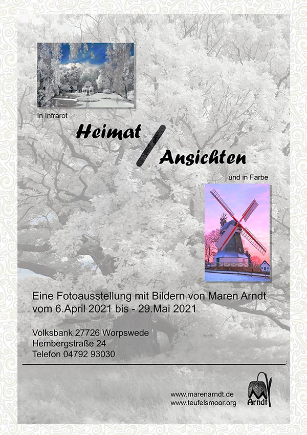 Besuchen Sie die Fotoausstellungen der Künstlerin Maren Arndt in der Volksbank Worpswede, 27726 Worpswede, Heubergstraße 24. 04792 93030.