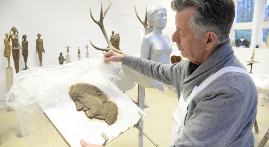 Jede Plastik, die eines Tages in Bronze gegossen wird, erhält ihre Formgebung mit einem anderen anderen Material. In diesem Fall wird wird das Porträt mit weichem Ton modelliert. Mehrere Umformungen sind nötig bis die flüssige Bronze als endgültiges Material zum Kunstwerk wird.