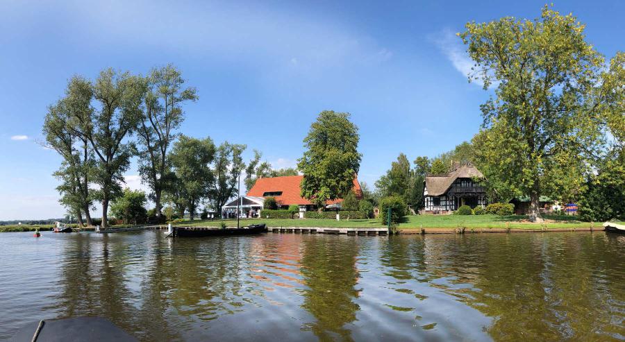 Torfkähne auf dem Fluss Hamme haben auf der Fahrt immer wieder schöne Ziele. Hier der Einlauf zum Anleger am Restaurant "Tietjens Hütte". Bereits seit Anfang der Torfschifffahrt im 17. Jahrhundert haben die Torfstecher mit ihren Kähnen für eine Pause auf der Fahrt nach oder von Bremen hier angelegt.