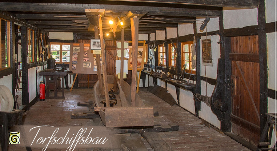 Doch zurück zu dem Bau der Torfkähne. Wenn es Aufträge für 600 Torfkähne allein auf dieser Werft gab, wie wertvoll musste der Torf gewesen sein, um alle diese Aufträge für Torfkähne zu bezahlen? Die größer werdende Stadt Bremen verlange nach Brennmaterial. Einst wurden in der ehemaligen Werft Torfschiffe gebaut. In diesen sogenannten Halbhuntschiffen konnten damals bis zu 50 Körbe mit Torf transportiert werden. Heute sind in der Fachwerkscheune Arbeitsgeräte für den Torfabbau, für den Bootsbau und Werkzeug einer Holzschuhmacherei zu sehen. Außerdem ist ein Torfschiff in seinem Originalzustand zu sehen. Viele Fotos zeigen, wie die Moorbauern der Teufelsmoorregion gelebt und gearbeitet haben.